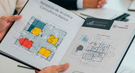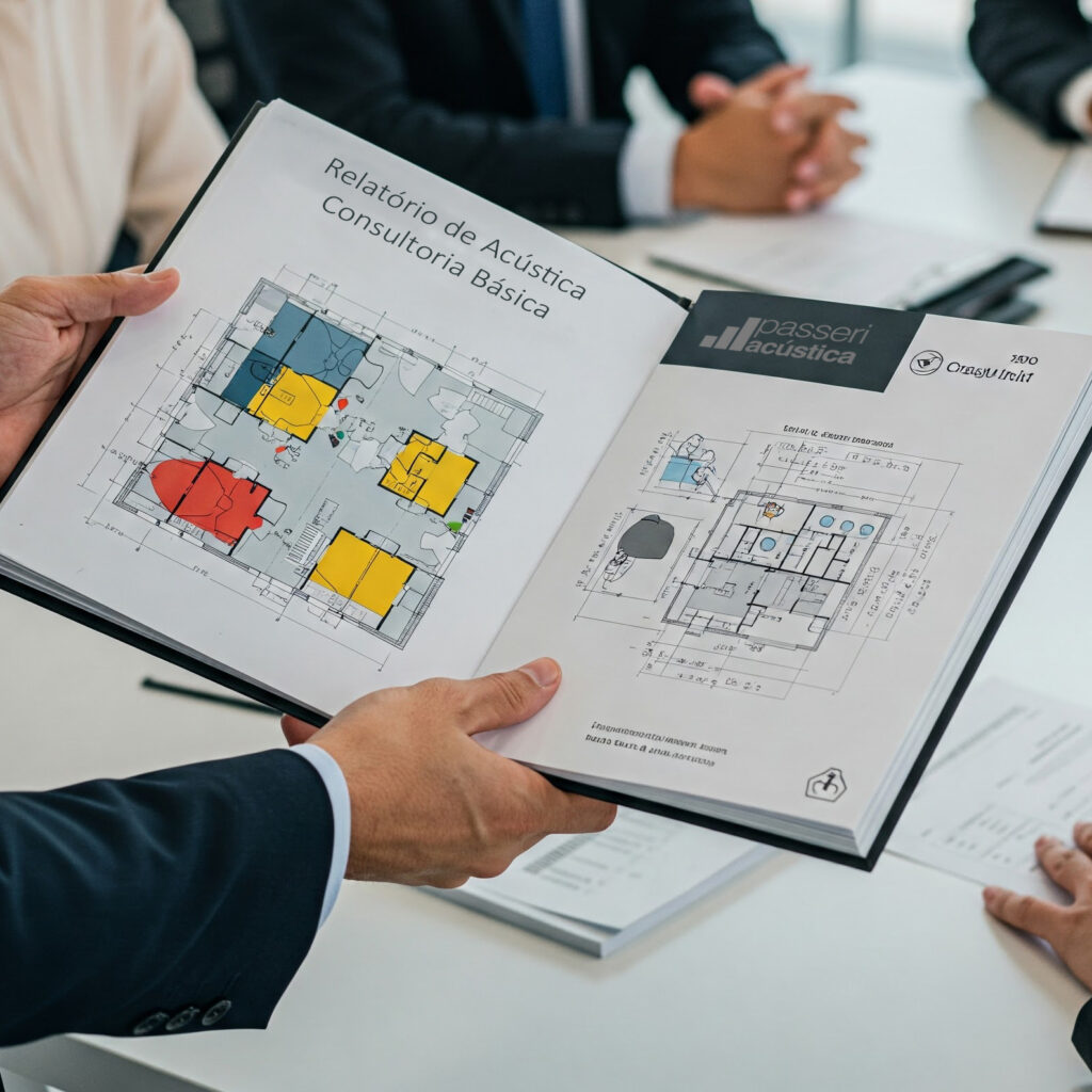 Posteriormente, elaboramos e emitimos um relatório técnico de consultoria executiva de acústica, em formato A3 ou A4, em que descrevemos textualmente os principais problemas e as respectivas soluções de acústica, acompanhado de uma planta baixa de cada ambiente (ou pavimento) em que indicamos a localização dos pontos de intervenção acústica e de desenhos técnicos correspondentes aos detalhes construtivos de cada solução proposta para os problemas verificados anteriormente, além de uma planilha sucinta de quantidades e de ART/RRT.