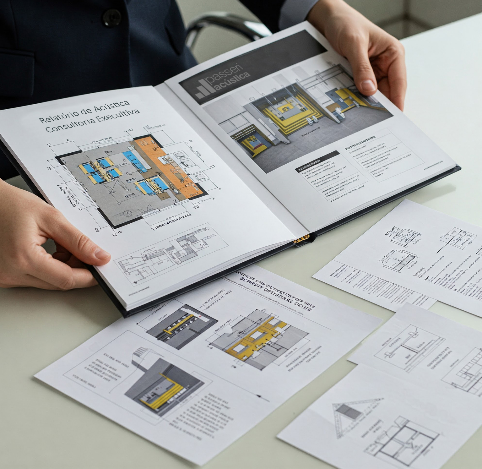 Posteriormente, elaboramos e emitimos um relatório técnico de consultoria acústica, em formato A4, em que descrevemos textualmente os principais problemas verificados e as respectivas possíveis soluções, sem a produção de desenhos técnicos ou planilha de quantidades. Não há emissão de ART/RRT.